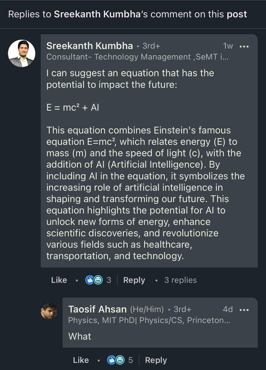 [12:49:55] Frogorg yournamehere: have you seen that dude on LinkedIn posting a comment that we should change Einstein's formula to E = mc^2 + AI?