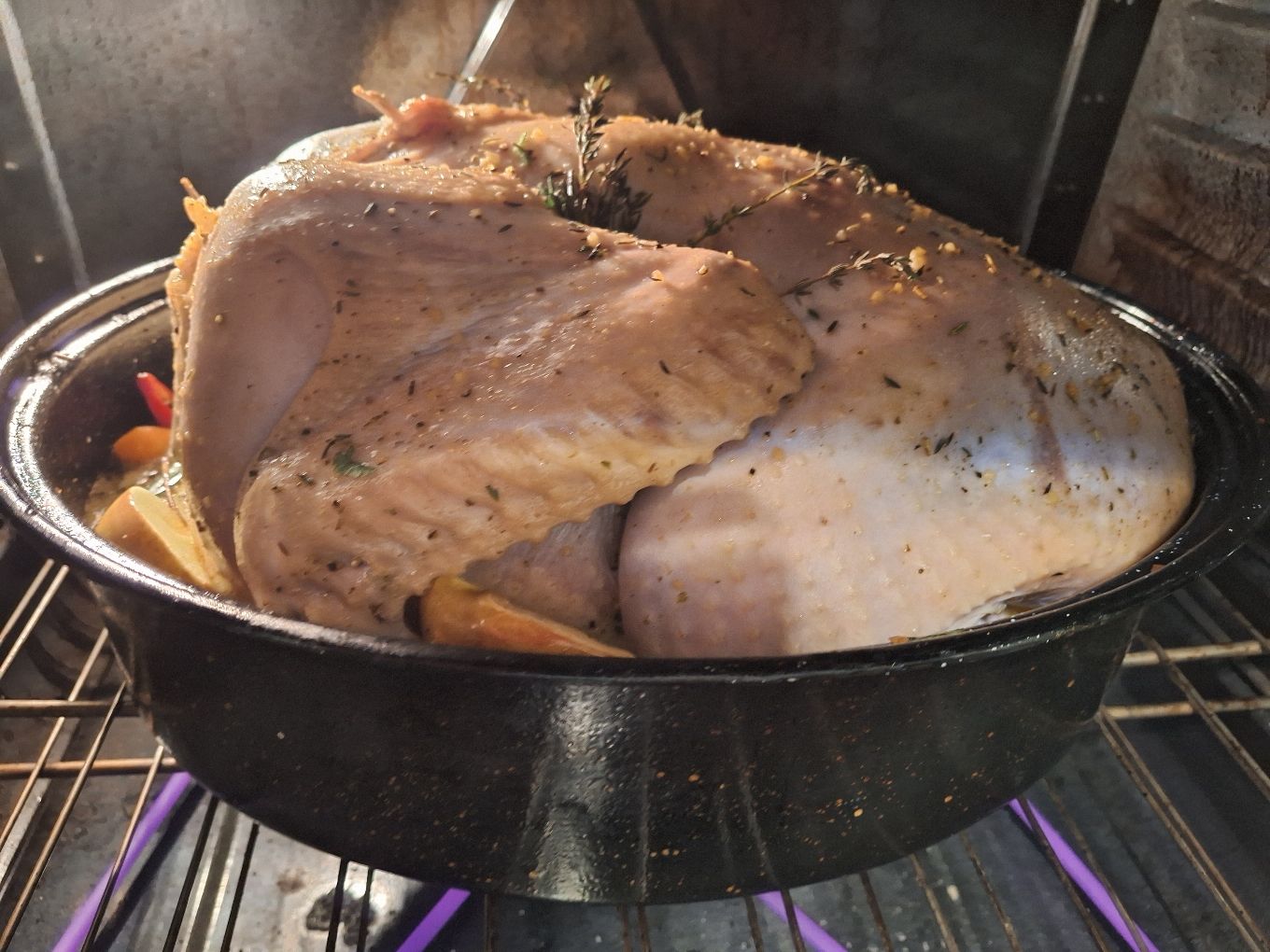 [17:05:43] Syndus_ I'm glazing with a blend of maple, butter, rosemary, thyme, brown sugar, bay. And tucked sprigs under the wings, pink Lady apples, half roasted and half broiled at the end there